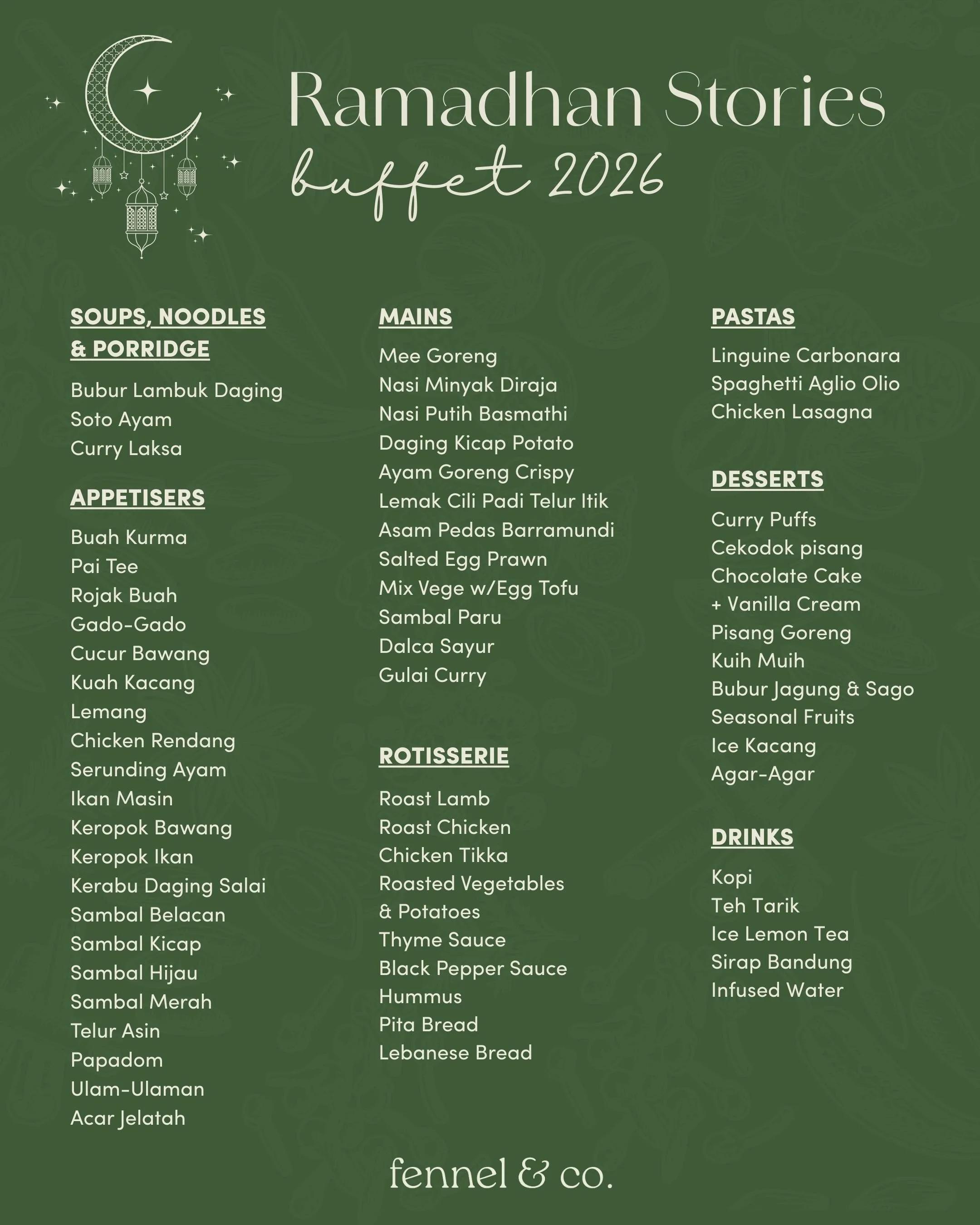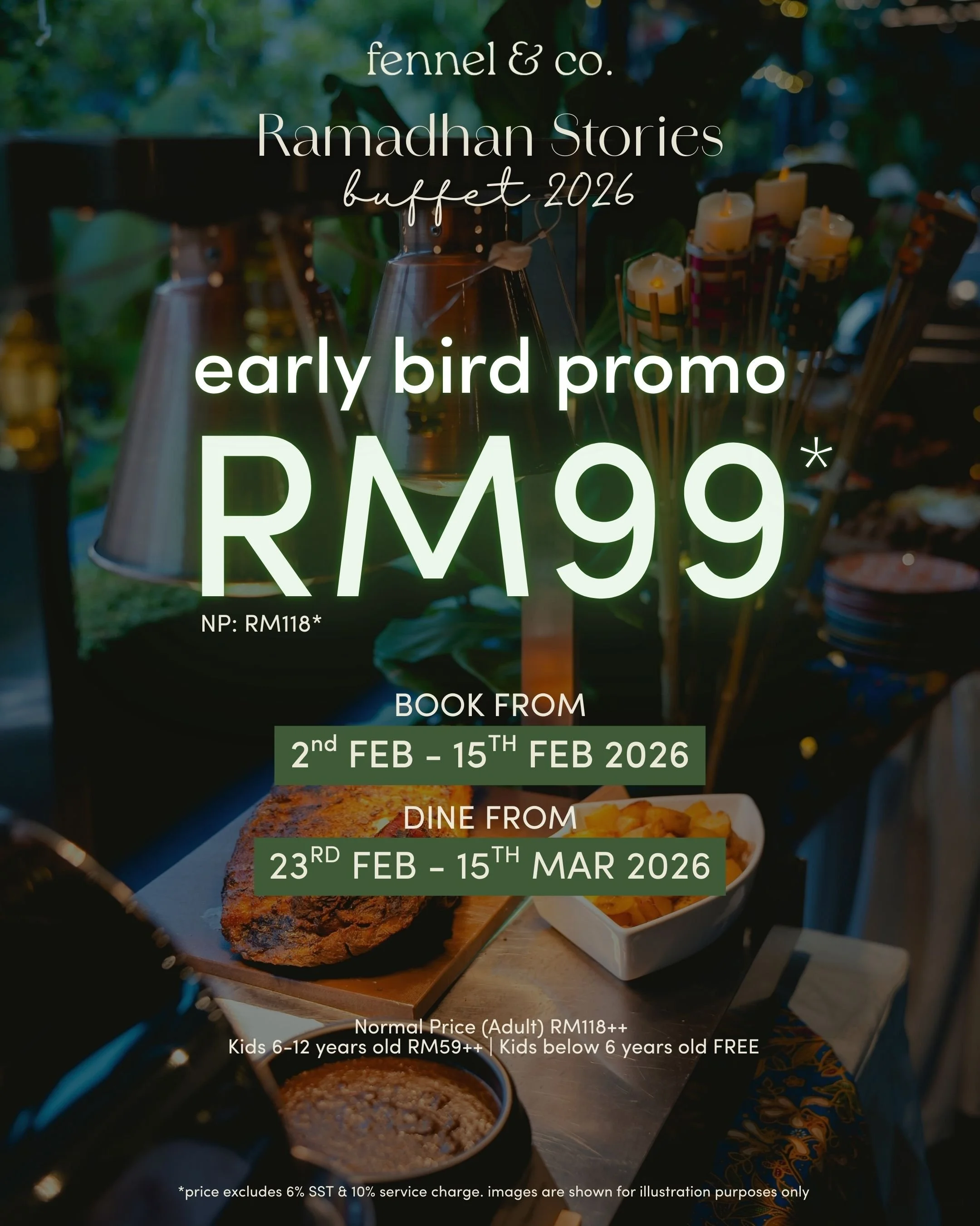 Set in the calm surroundings of Bukit Tunku, Fennel & Co. offers a cozy atmosphere for Iftar, complete with a surau on-site and the assurance of being Halal-certified by JAKIM. A space to slow down, reflect, and share meaningful meals this Ramadhan.